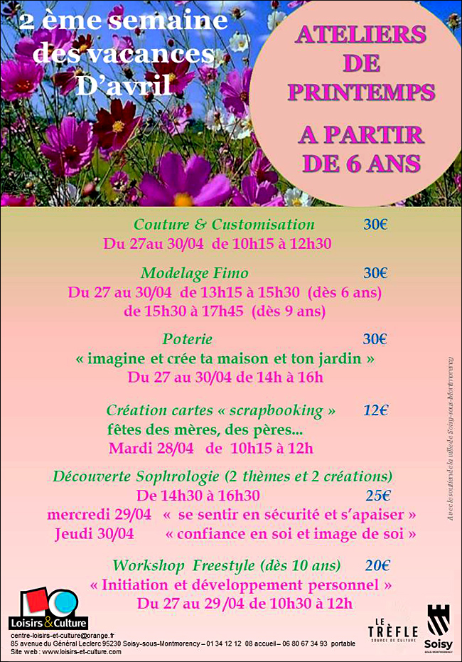Activités 2026 Télécharger la nouvelle plaquette L&C 2025/2026 Télécharger les fiches d’inscriptions 2025/2026 • Fiche d’inscription Adulte • Fiche d’inscription Enfant Inscriptions 2025/2026 Horaires Lundi et jeudi : ferméMardi : 10h-12hMercredi : 15h-18hVendredi : 15h-18h30Samedi : 10h-12h Notre nouveau numéro de téléphone : 01 34 12 12 08 A bientôt Loisirs & Culture Accéder à la page FaceBook L&C